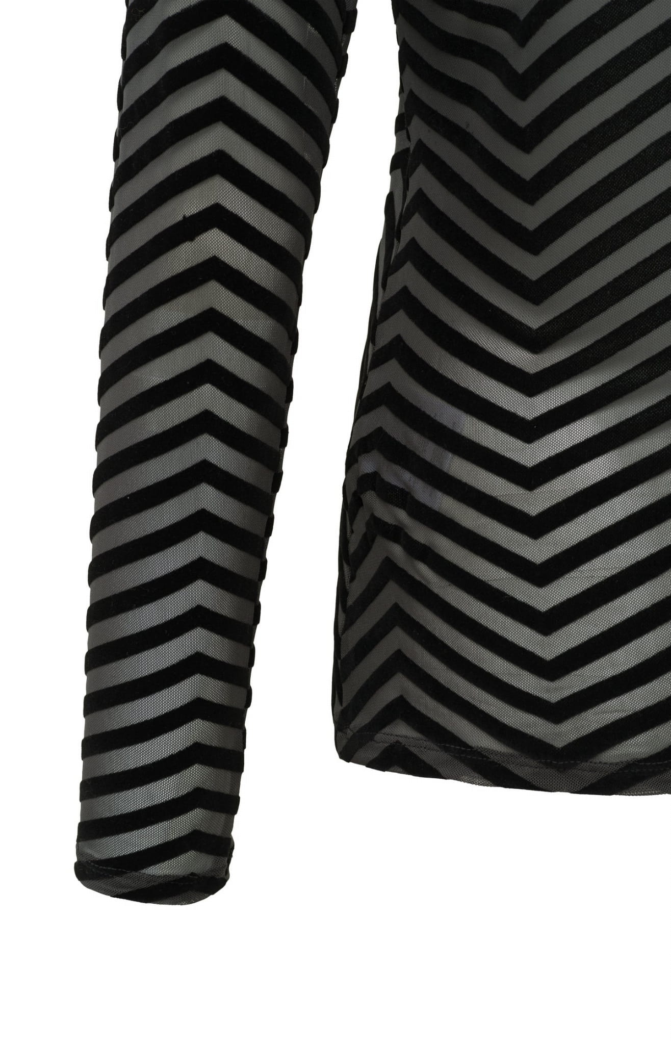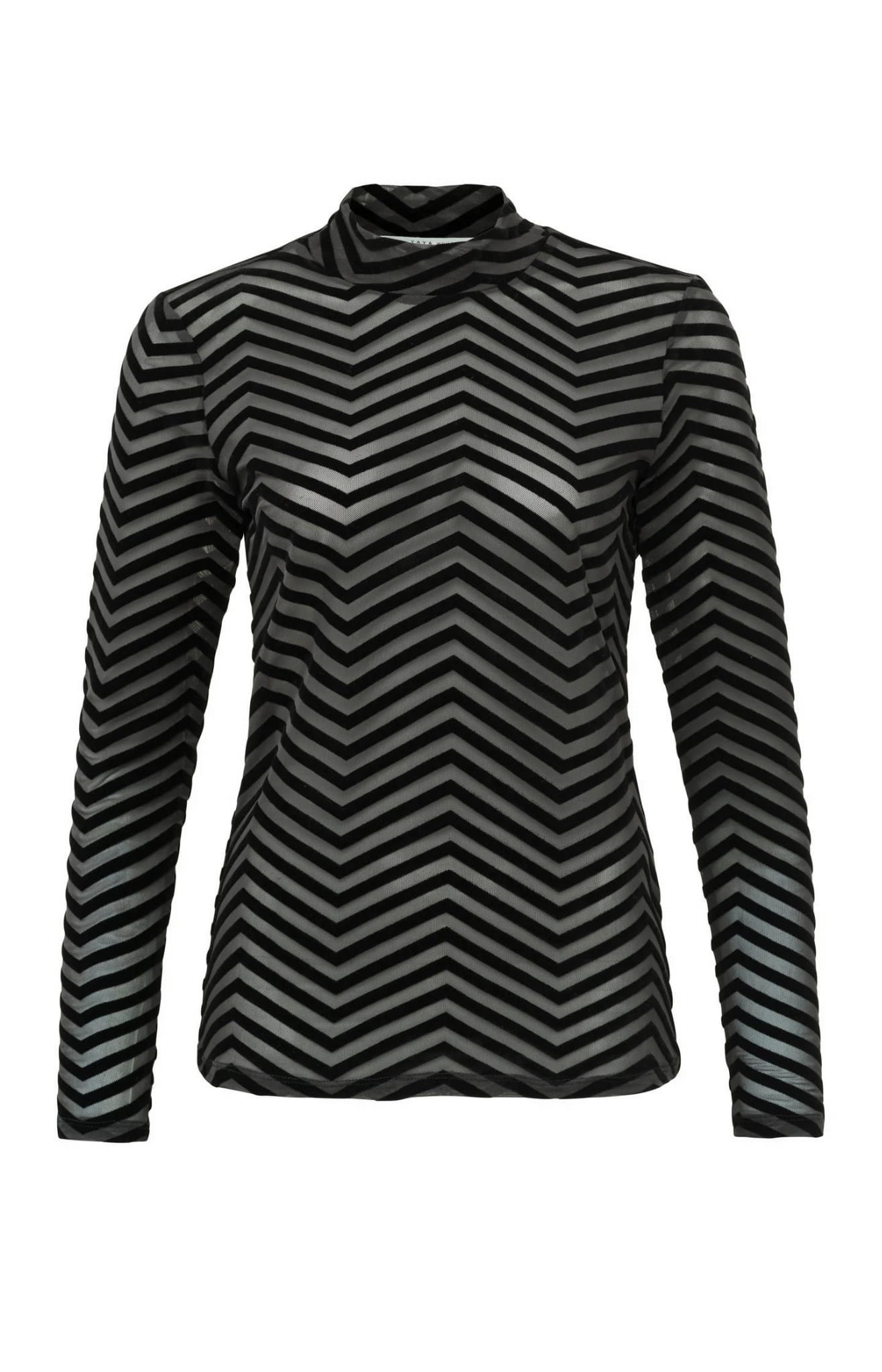 Top o dopasowanym kroju, posiadający wysoki dekolt, długie rękawy i nietuzinkowy nadruk.