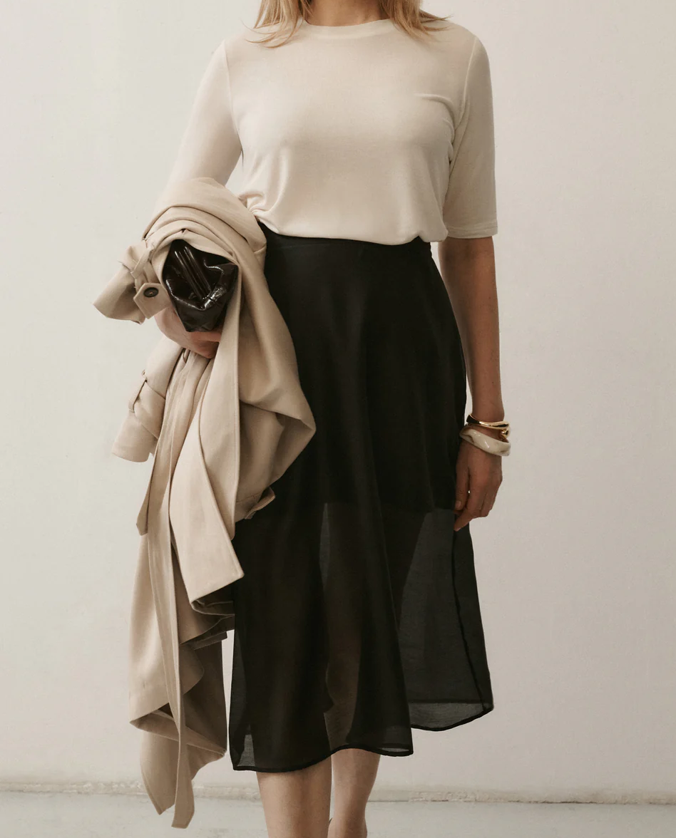 CRISTINA to bluzka, która łączy luksusowy komfort z nowoczesną prostotą. Dzianina z tencelem i wełną oddycha, miękko otula skórę i pięknie pracuje w ruchu. Subtelna transparentność dodaje lekkości, a lekko dopasowany krój podkreśla sylwetkę bez wysiłku. Okrągły dekolt pod szyję tworzy spokojną, ponadczasową linię i stanowi doskonałe tło do minimalistycznej biżuterii. Idealna przez cały rok, do pracy i poza nią. Jeśli cenisz jakość i ponadczasowy styl, sięgnij po nią teraz. To model, który szybko znika.