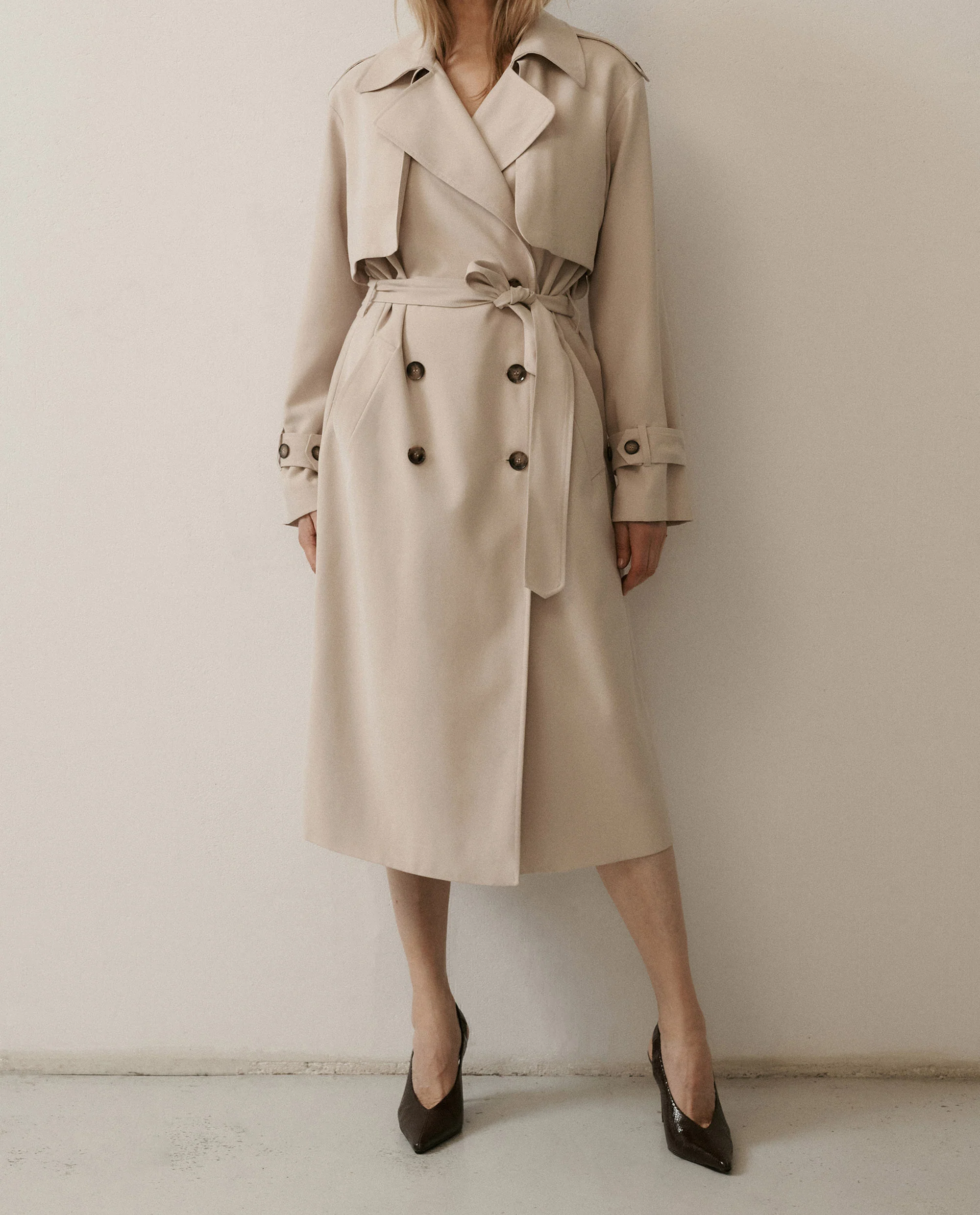 Uniwersalny płaszcz typu trencz wykonany z lejącej tkaniny z włóknem lyocell, która miękko układa się na sylwetce i dobrze pracuje w ruchu. Klasyczny beżowy kolor podkreśla ponadczasowy charakter i łatwo wpisuje się w garderobę kapsułową. To model odpowiedni na co dzień i do eleganckich stylizacji. Do pracy zarzuć go na garnitur, na weekend za miastem połącz go z jeansami i T-shirtem, a na co dzień noś go z koszulą KIM, spodniami typu dzwon PILAR i sportowymi butami.
