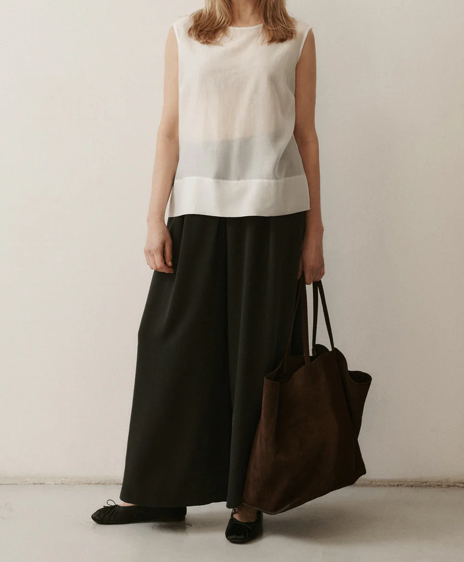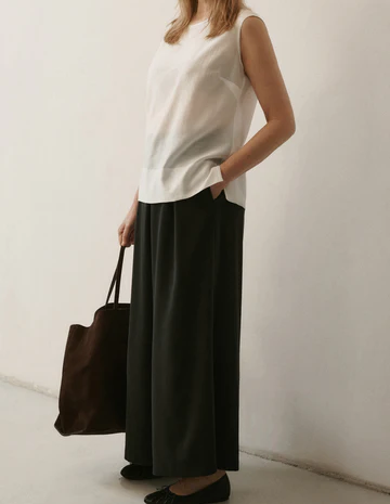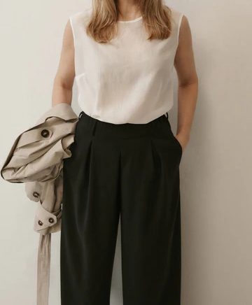 Spodnie ANGELA o szerokiej nogawce z zakładkami to model, który łączy komfort z nowoczesną linią. Uszyte z tkaniny tencel pozostają lekkie, oddychające i przyjemne dla skóry, a materiał miękko układa się na sylwetce i pracuje w ruchu. Długość do kostki nadaje nowoczesne proporcje, a szeroka nogawka tworzy płynną linię. Elastyczna guma w tylnej części pasa zapewnia wygodne dopasowanie. Kieszenie stanowią praktyczne dopełnienie o minimalistycznym charakterze.