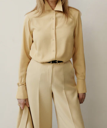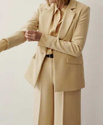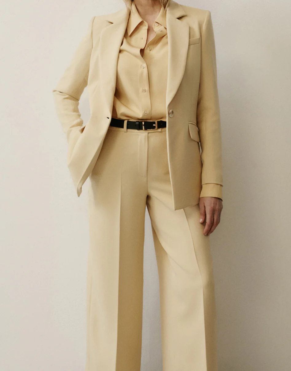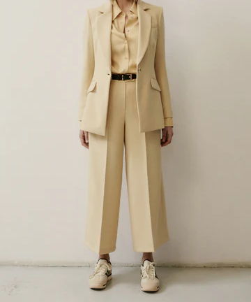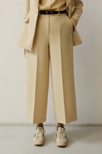 Spodnie FLOR o długości do kostki zaprojektowane z myślą o budowaniu proporcji sylwetki i wygodzie. Wyższy stan podkreśla talię i buduje smukłą linię sylwetki, a elastyczna guma w tylnej części pasa zapewnia komfortowe dopasowanie. Lekko rozkloszowana nogawka nadaje formie lekkości i równoważy proporcje. Kieszenie stanowią funkcjonalne dopełnienie, zachowując minimalistyczny charakter modelu. Spodnie wraz z marynarką MEGI uszytą z tej samej tkaniny tworzą elegancki garnitur na co dzień i na imprezy okolicznościowe.