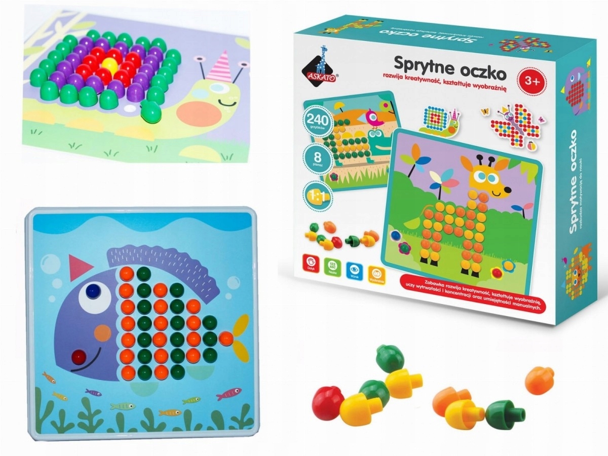 - Propozycja dla dzieci w wieku przedszkolnym. Za pomocą 240 kolorowych pinezek i 8 plansz z wzorami dziecko ćwiczy odwzorowywanie - czyli analizę i syntezę wzrokową.