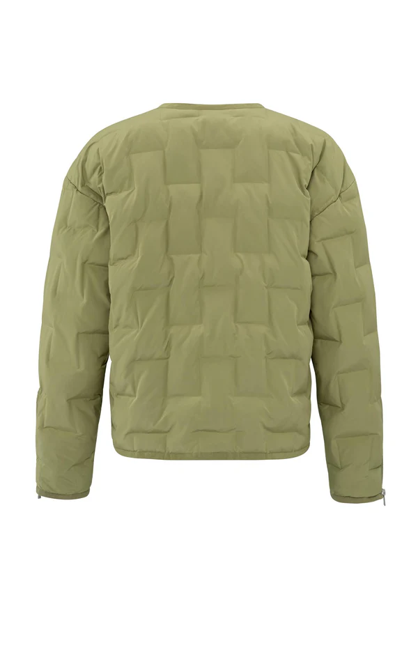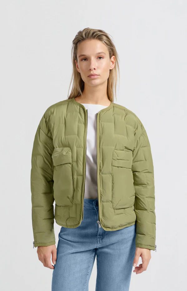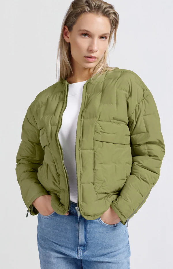 Ta stylowa krótka kurtka w kolorze oliwkowej zieleni jest wykonana z lekkiego nylonu i ma pikowany design. Z okrągłym dekoltem, zapięciem na suwak i pojemnymi kieszeniami oferuje zarówno funkcjonalność, jak i nowoczesny wygląd. Idealna na pogodę przejściową i łatwa do sparowania z codziennymi strojami.