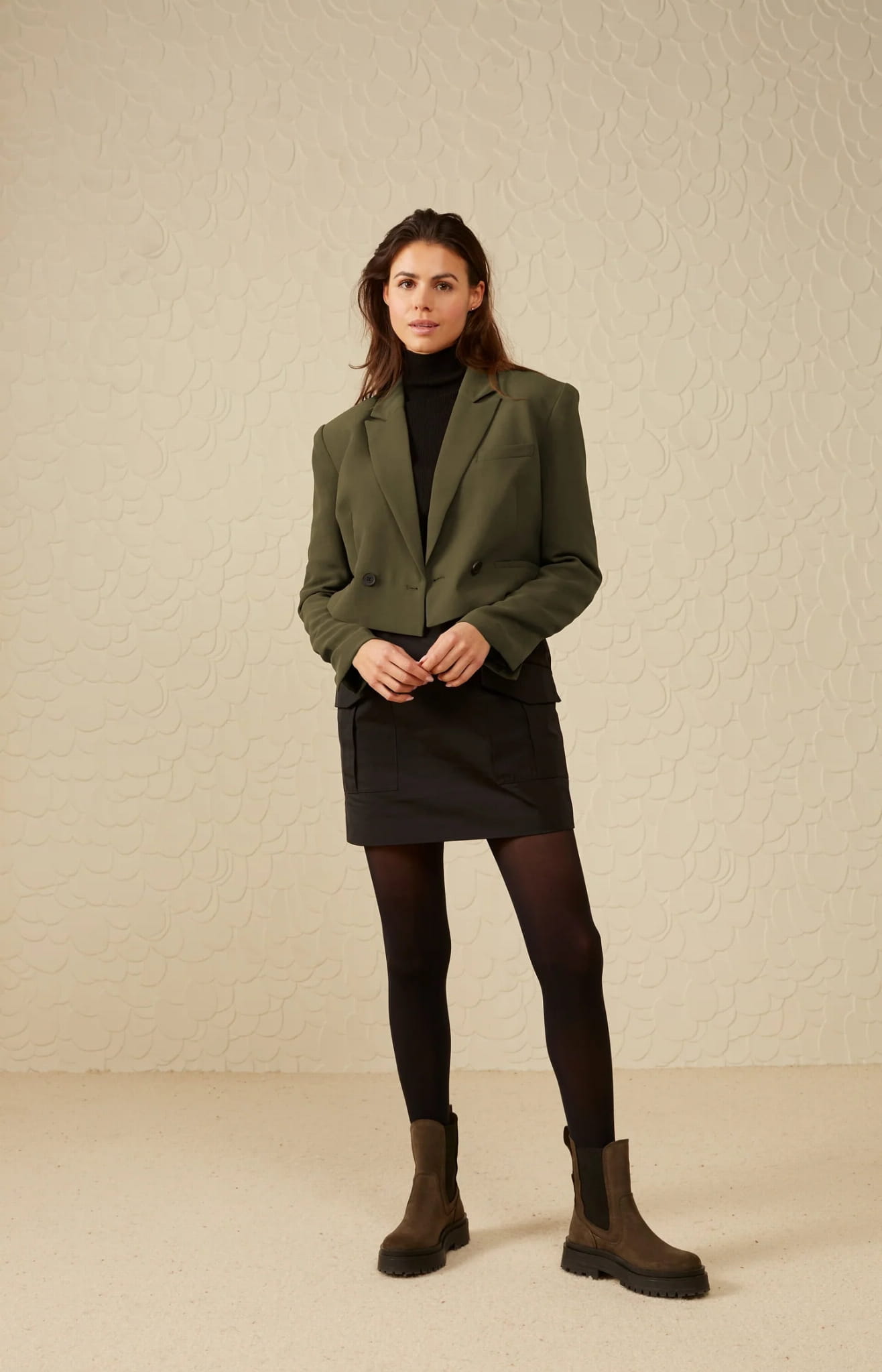 Minispódniczka, posiadająca kieszenie cargo, pasek cargo oraz zapięcie na zamek błyskawiczny.