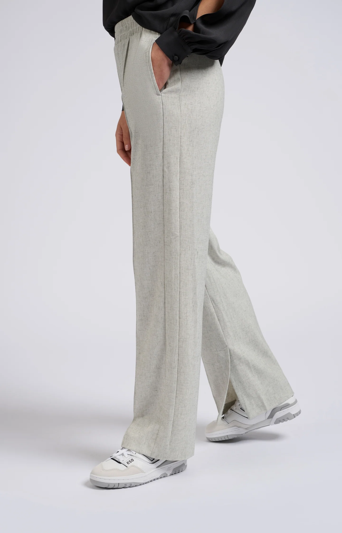 Te stylowe spodnie mają szerokie nogawki z rozcięciem, elastyczny pas i melanżowy tkany wygląd. Detale tych szarych spodni zapewniają równowagę między komfortem a elegancją.