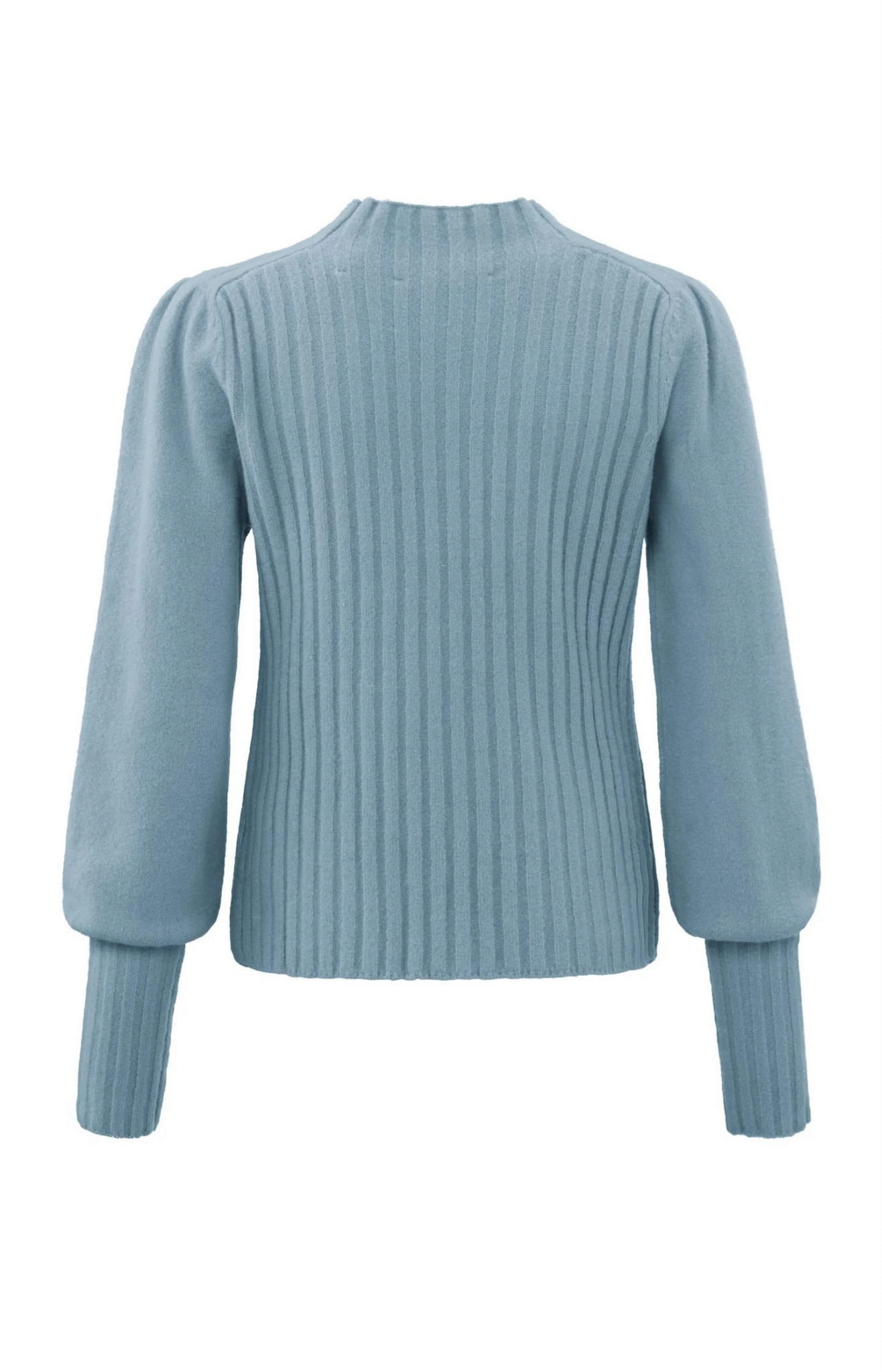 Elegancki prążkowany sweter z wysokim dekoltem i długimi bufiastymi rękawami.