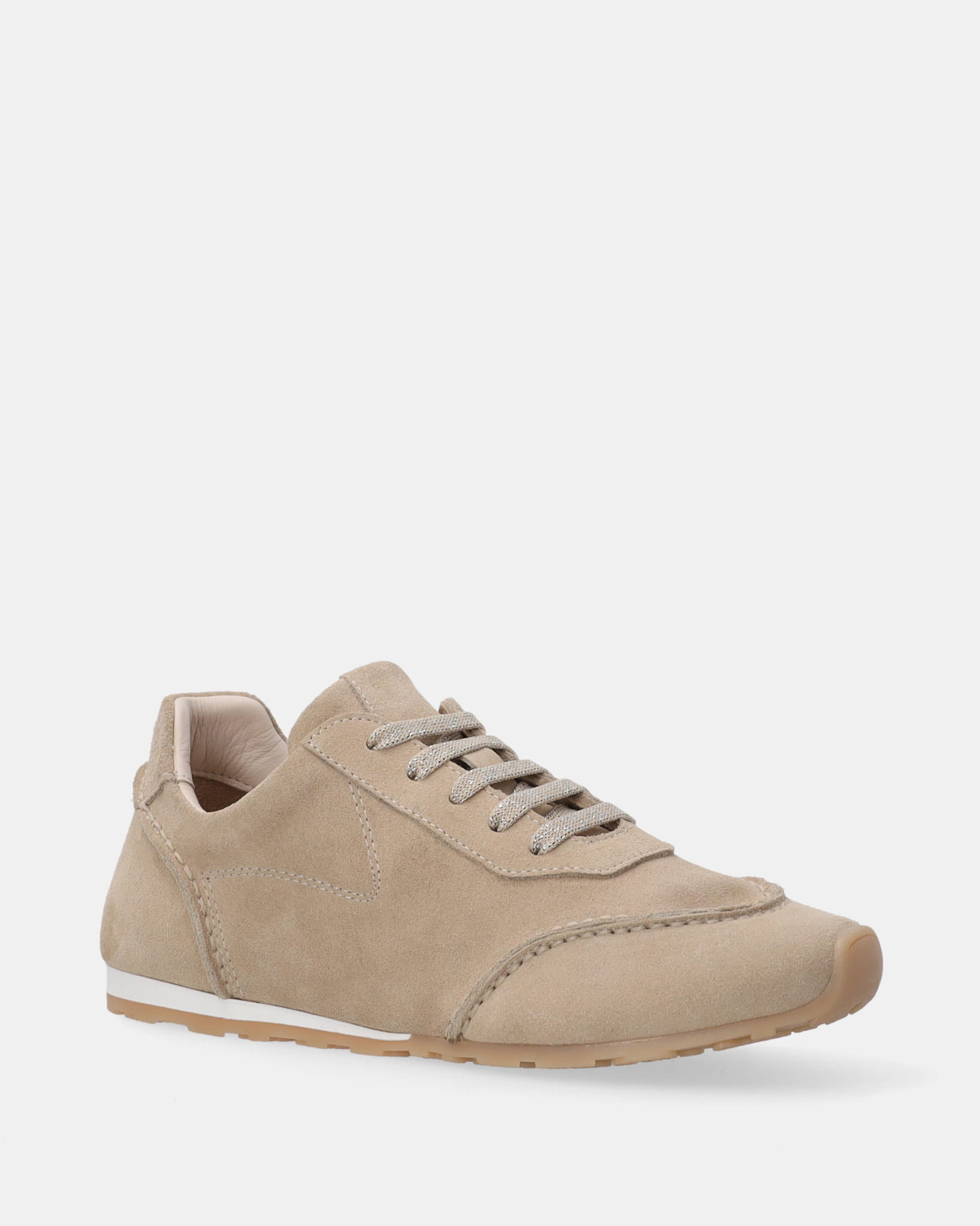 Beżowe, damskie buty wykonane z miękkiej skóry zamszowej. Klasyczny fason wzbogacono o sznurowadła z subtelnym, metalicznym wykończeniem, które dodają całości eleganckiego charakteru. Lekka, elastyczna podeszwa oraz skórzana wyściółka zapewniają komfort noszenia przez cały dzień.