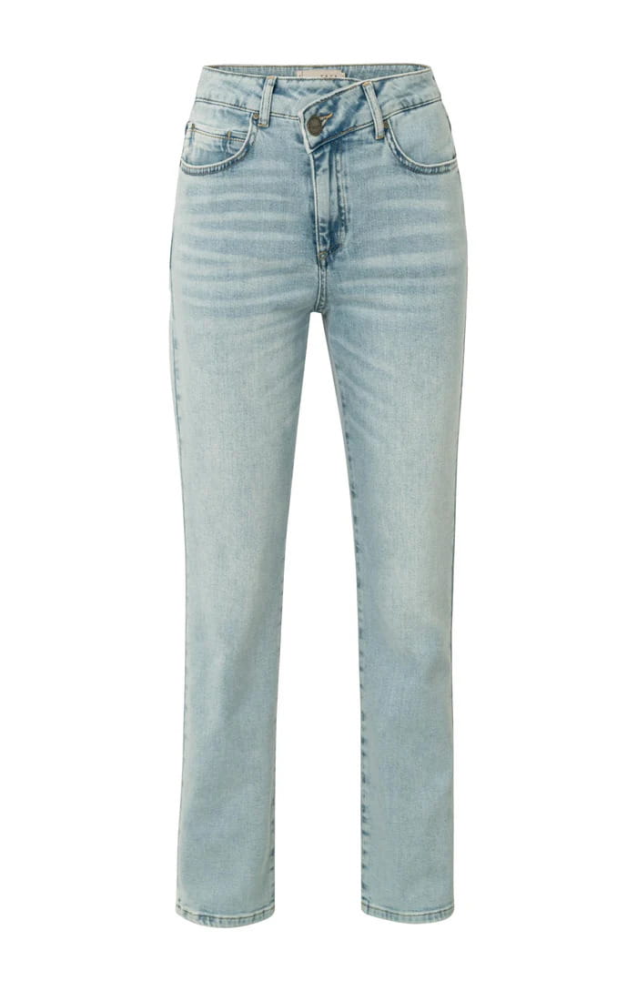 Te stylowe jeansy mają prosty krój i subtelne, kopertowe wykończenie w talii,