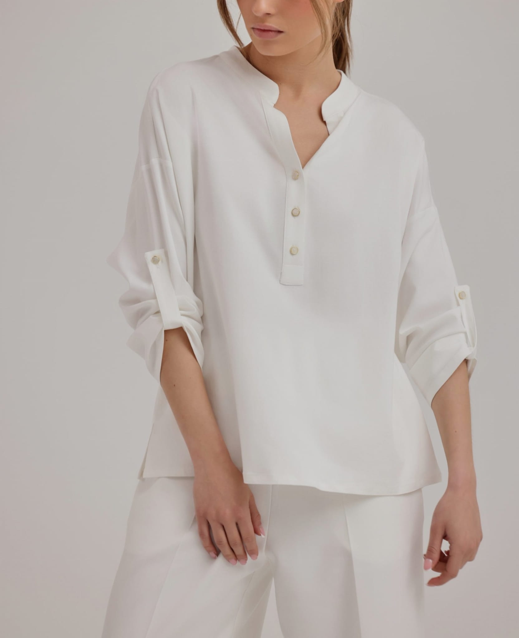 Bluzka z mięsistej wiskozy, z dekoltem odszytym plisą. Z rękawem z regulatorem do podwinięcia.