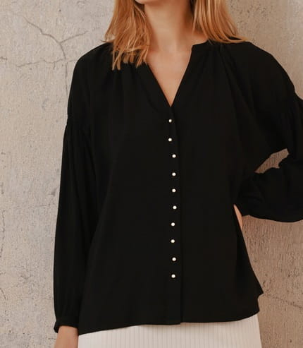 Koszulowa bluzka uszyta z mięsistej wiskozy, wykończona przy szyi plisą. Z opadającą linią ramienia i delikatnie marszczoną i stębnowaną górą rękawa. Rękaw zakończony wąskim mankietem. Zapinana na subtelne, malutkie, perłowe guziczki.