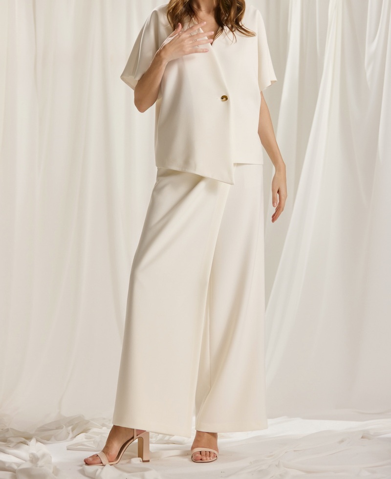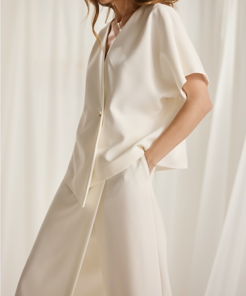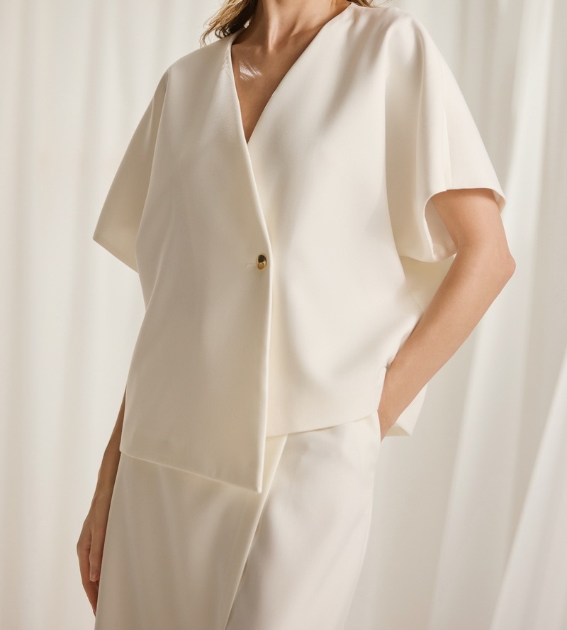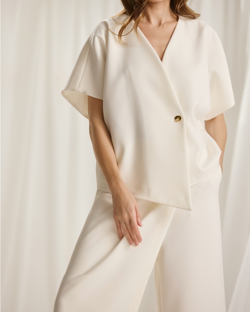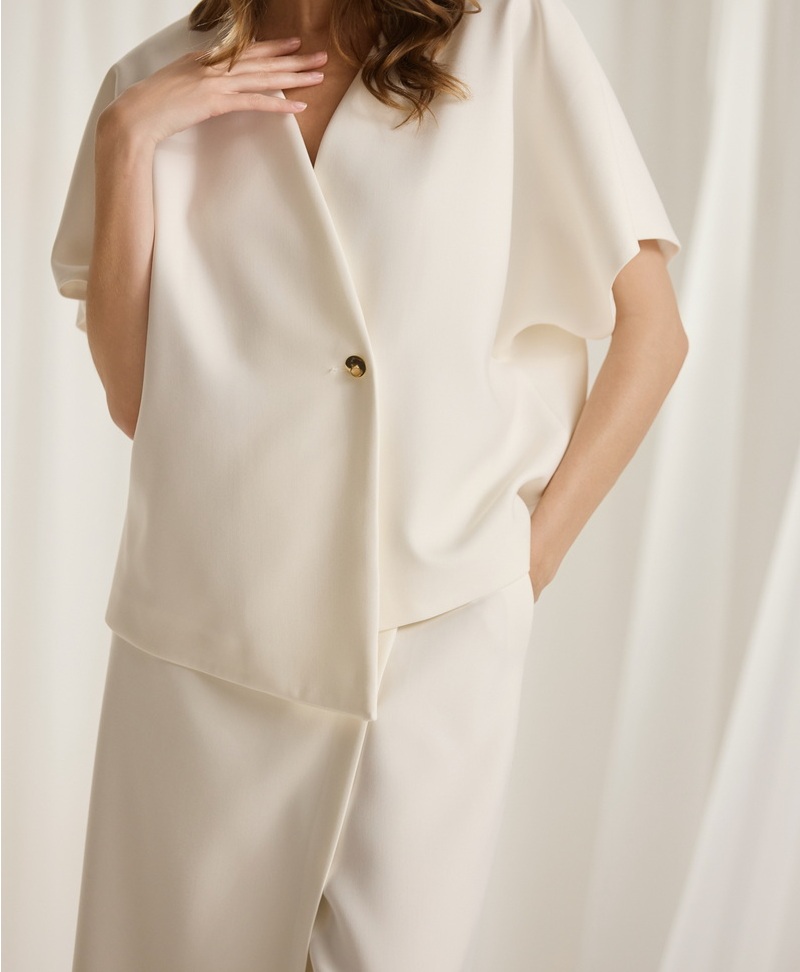 Asymetryczna kamizelka zapinana na jeden ozdobny złoty guzik.