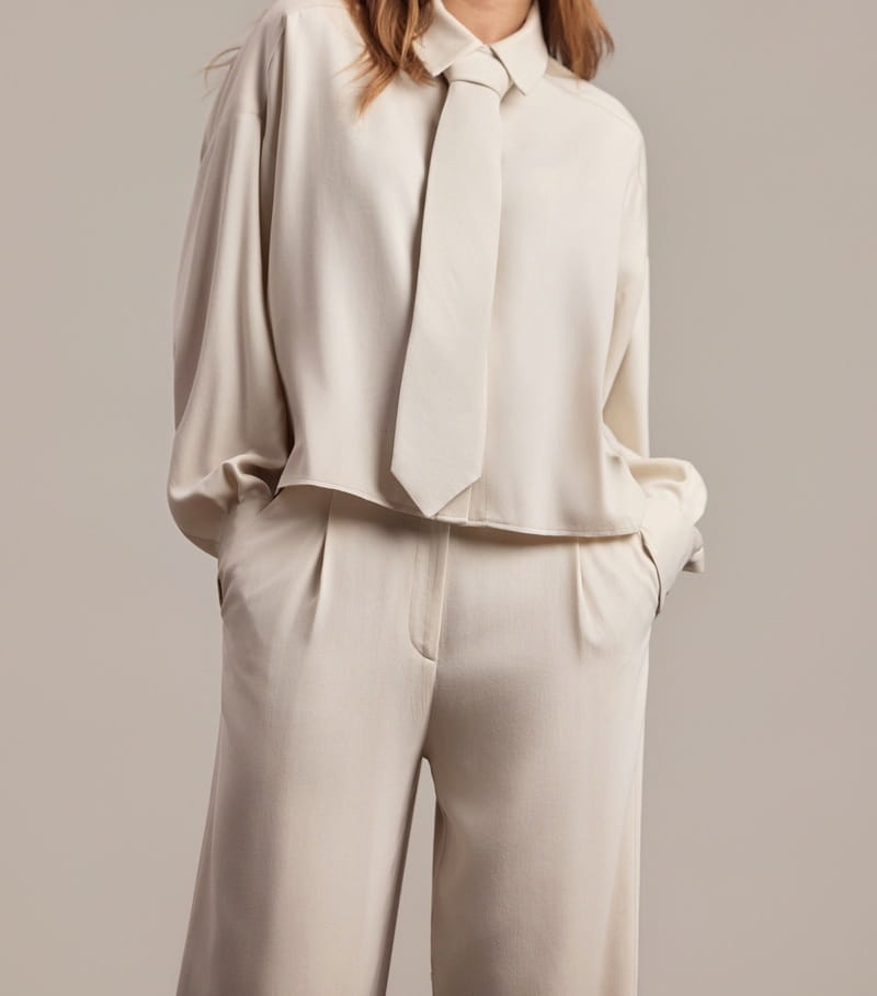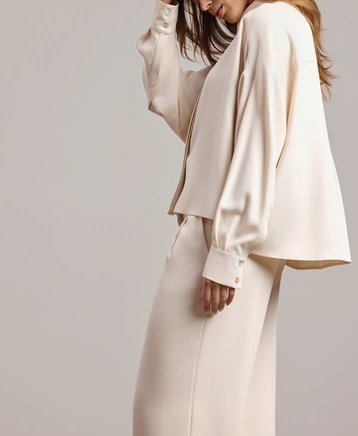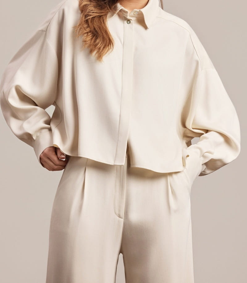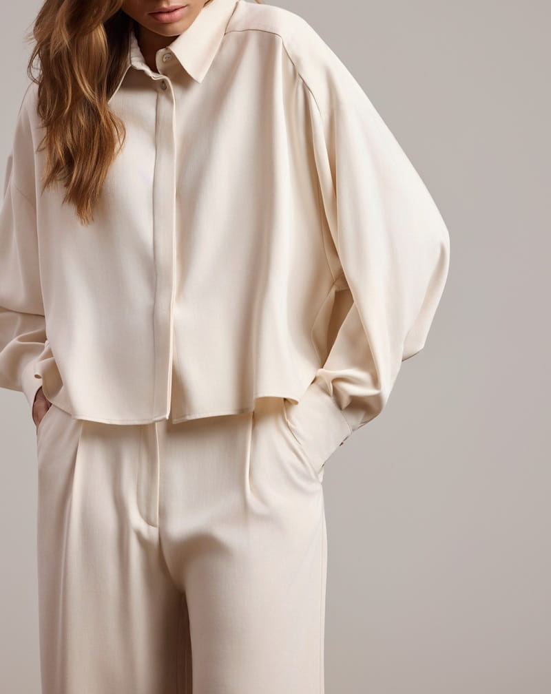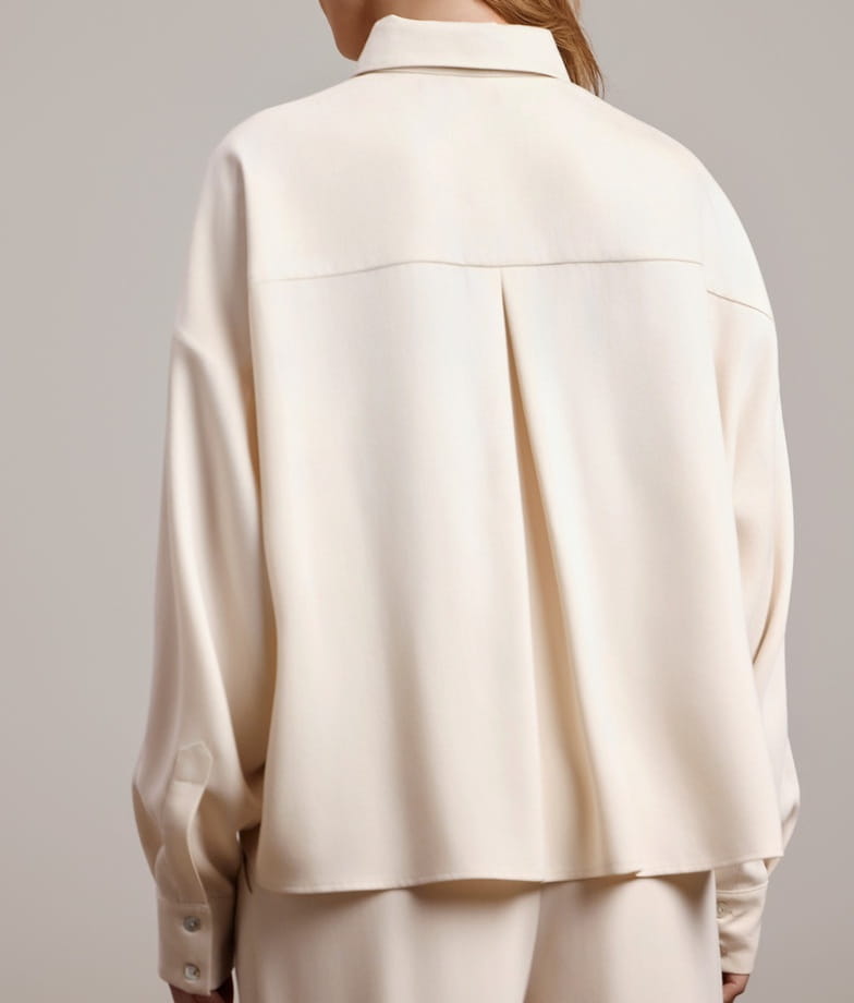 Krótka koszula o pudełkowym kroju z krytą plisą. Rękaw zakończony mankietem.