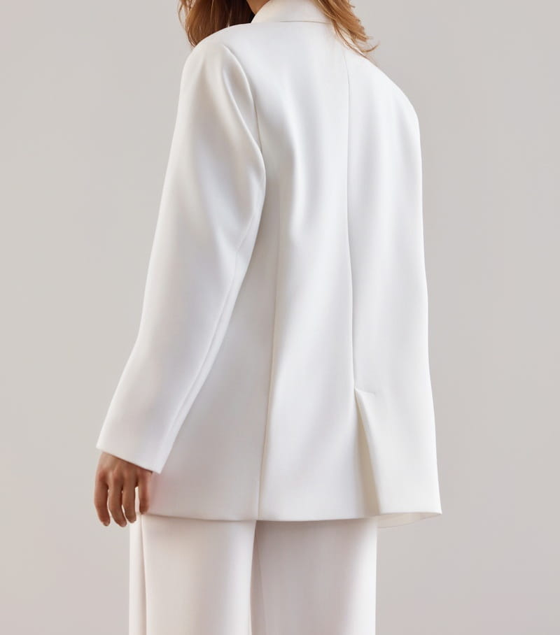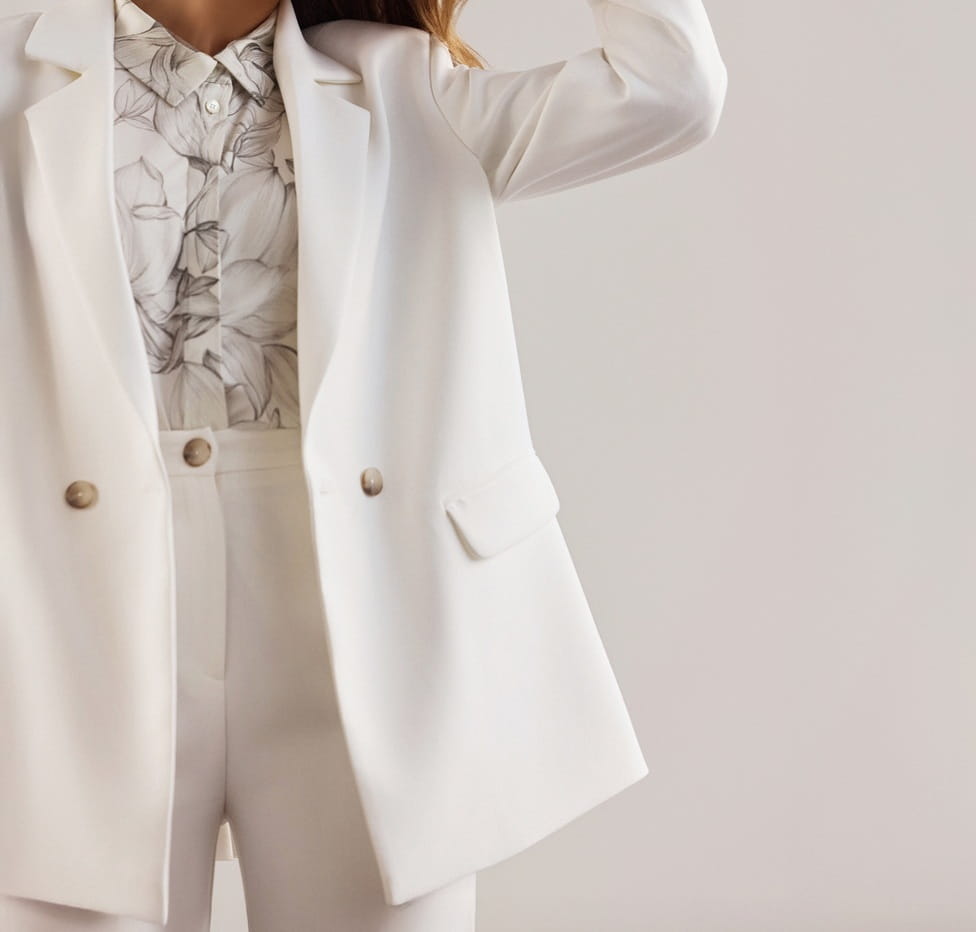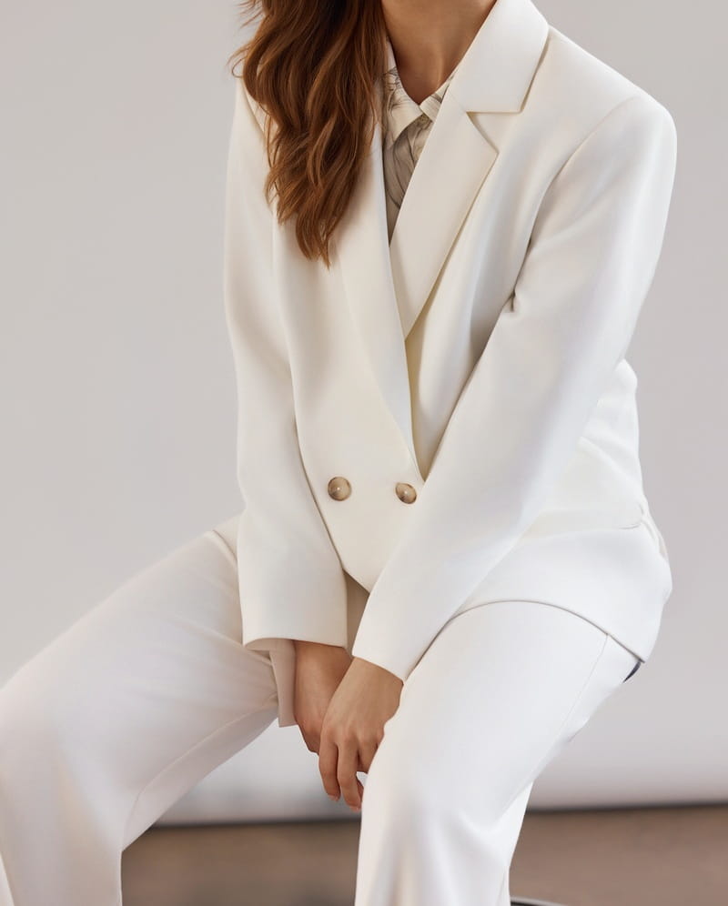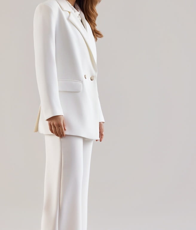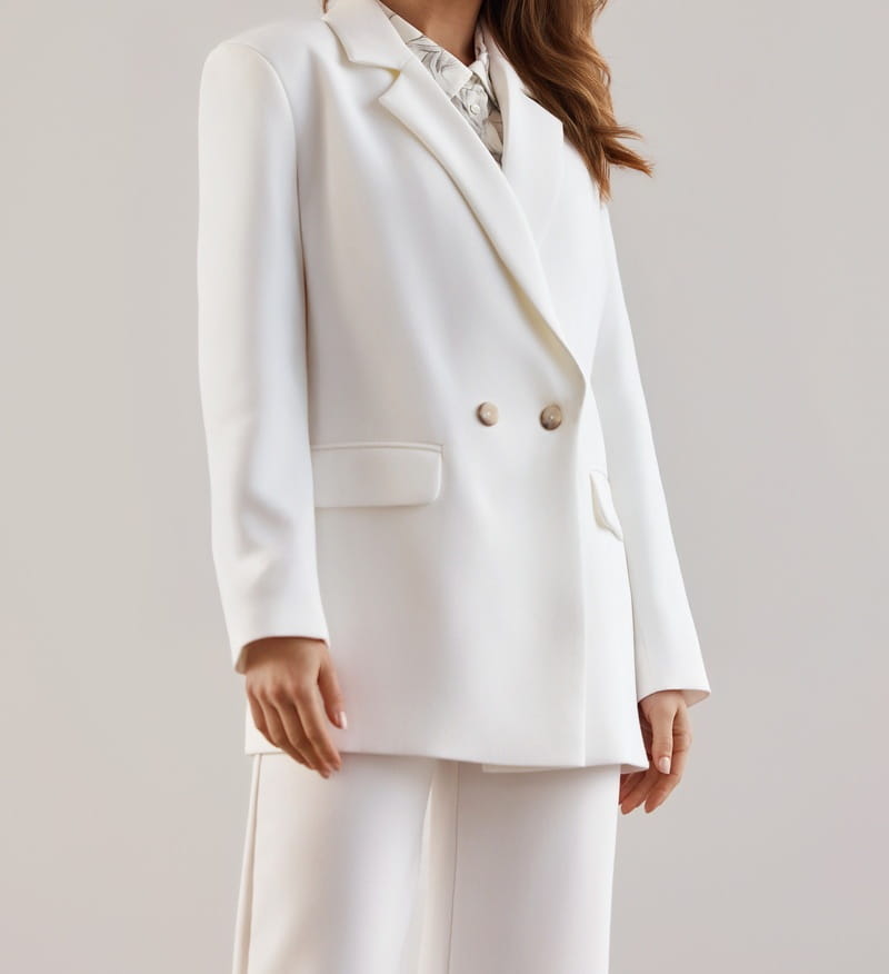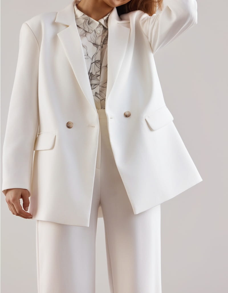 Ecru, dwurzędowa marynarka o lekko oversize’owym kroju.