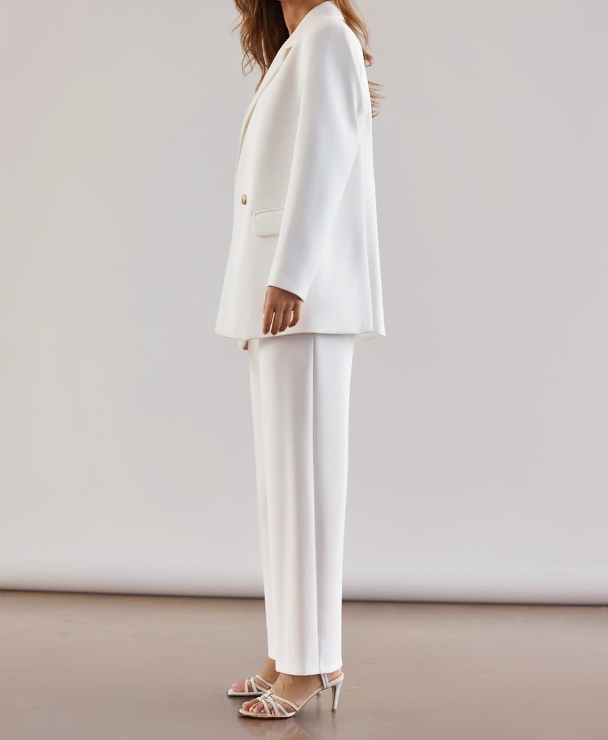 Marynarka ELISE została uszyta ze sprężystej tkaniny w kolorze ecru odpornej na gniecenie i mechacenie.