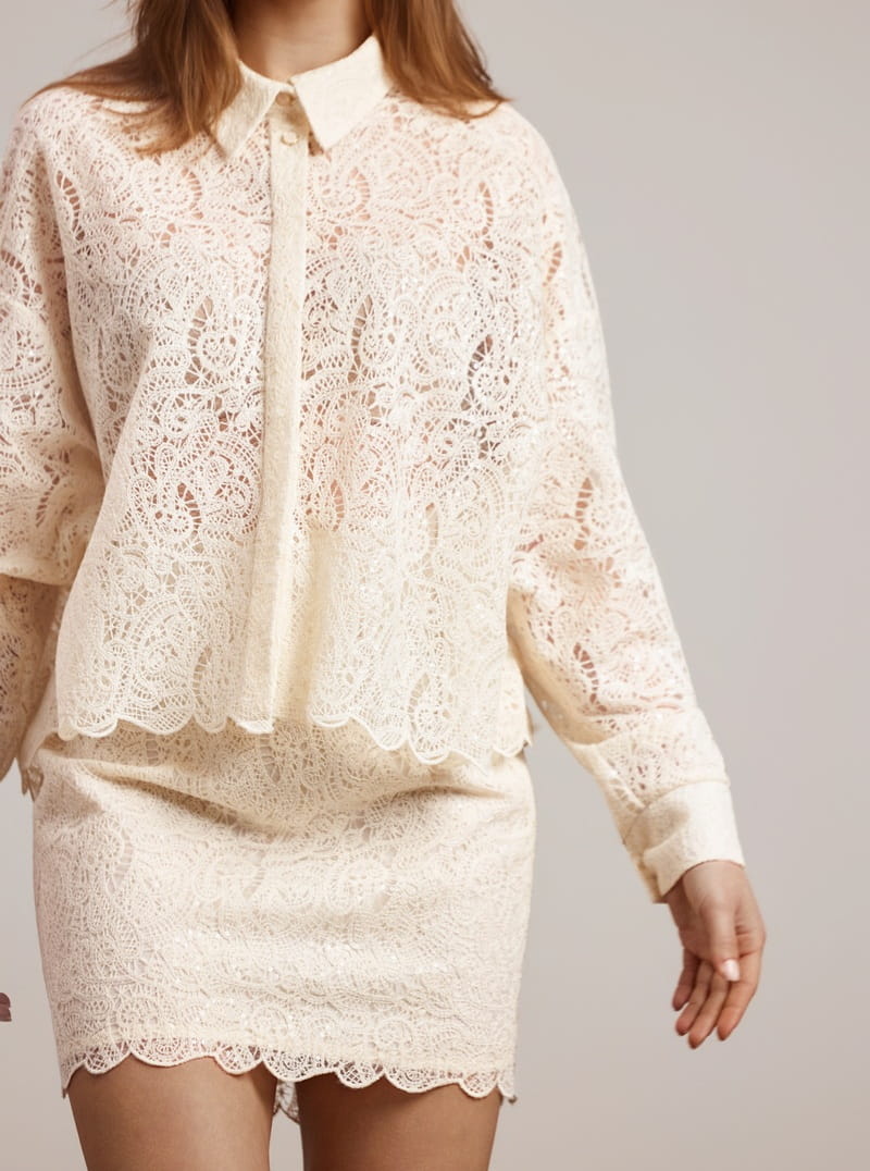 Krótka spódnica z misternej koronki, dodatkowo zdobionej delikatnymi, przezroczystymi cekinami .