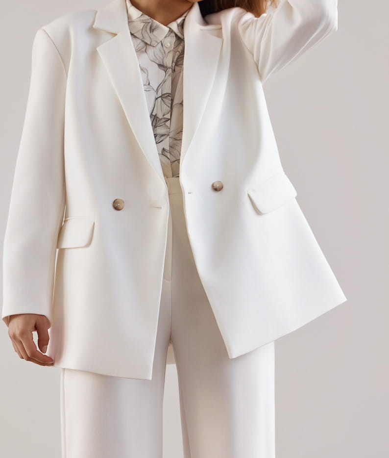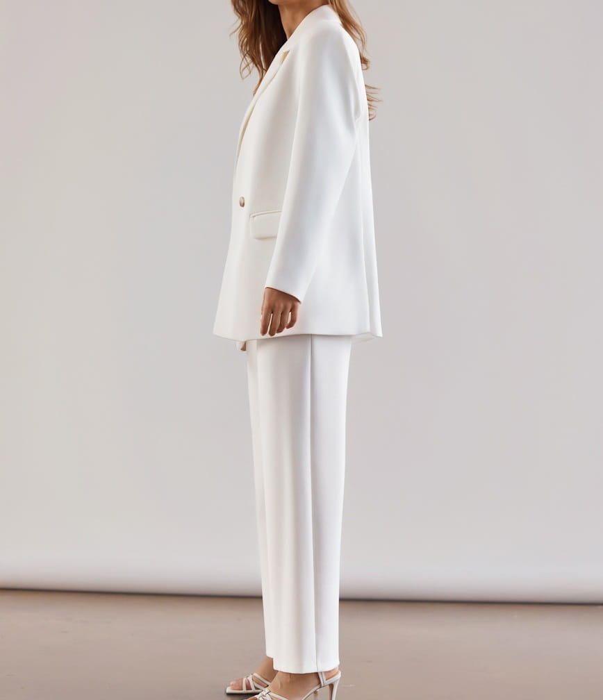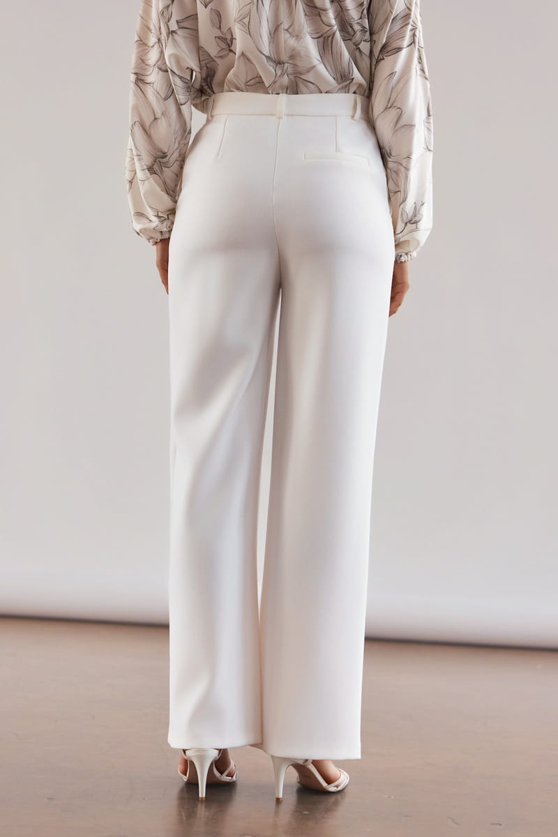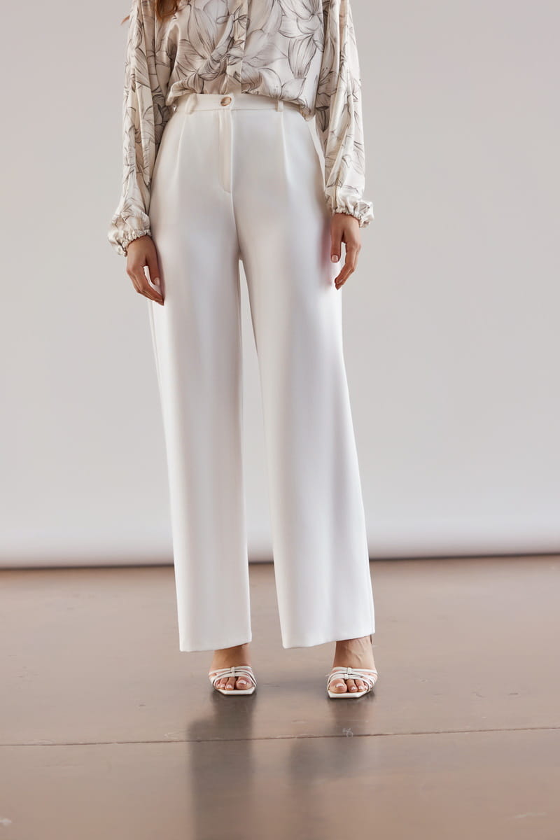 Uszyte z mięsistej, lejącej tkaniny w pięknym odcieniu ecru, która nie gniecie się i nie mechaci. Spodnie pięknie układają się na sylwetce i zapewniają komfort noszenia przez cały dzień.