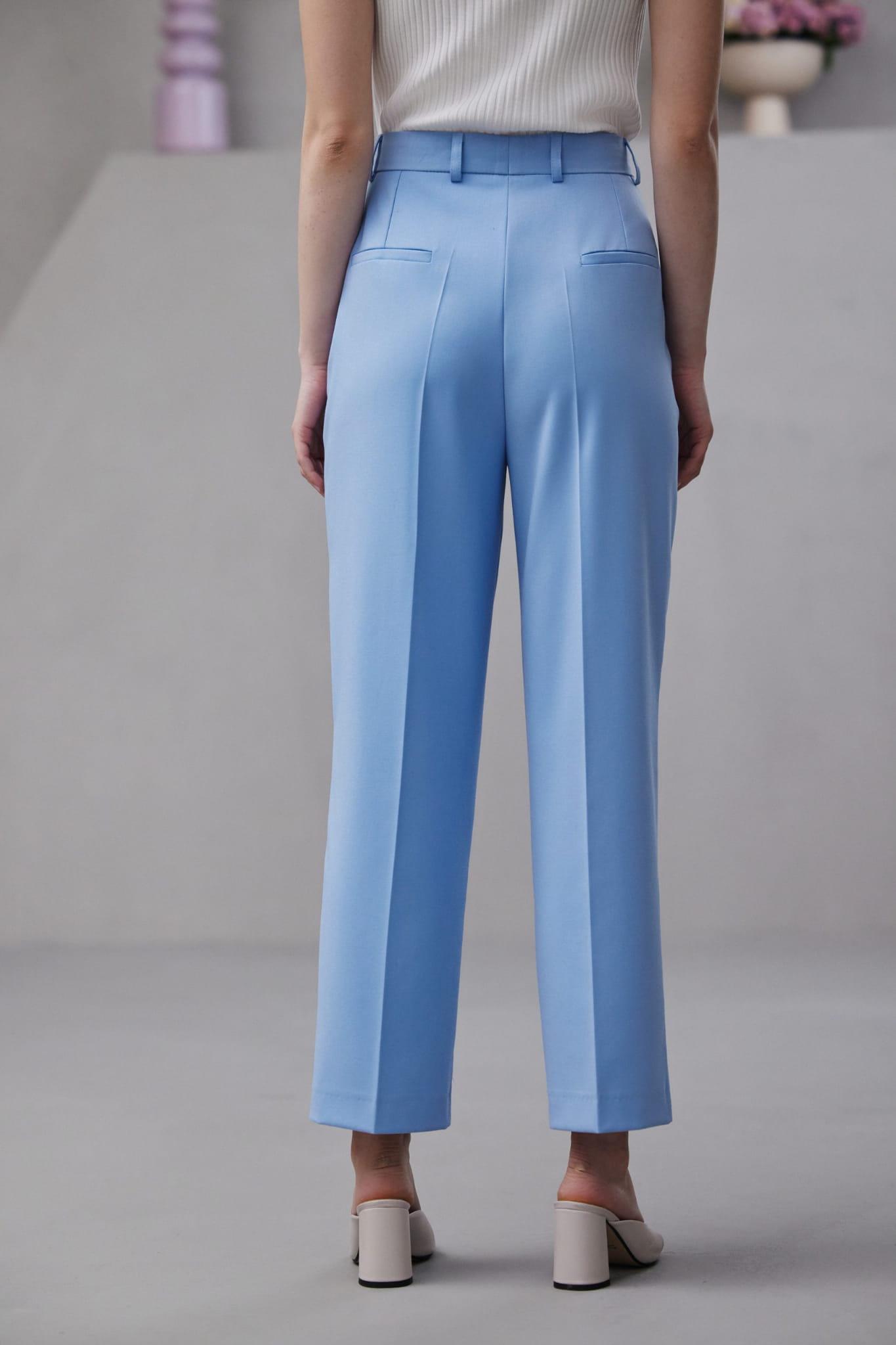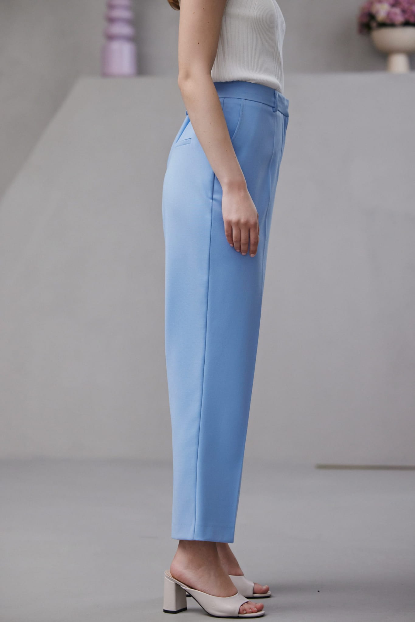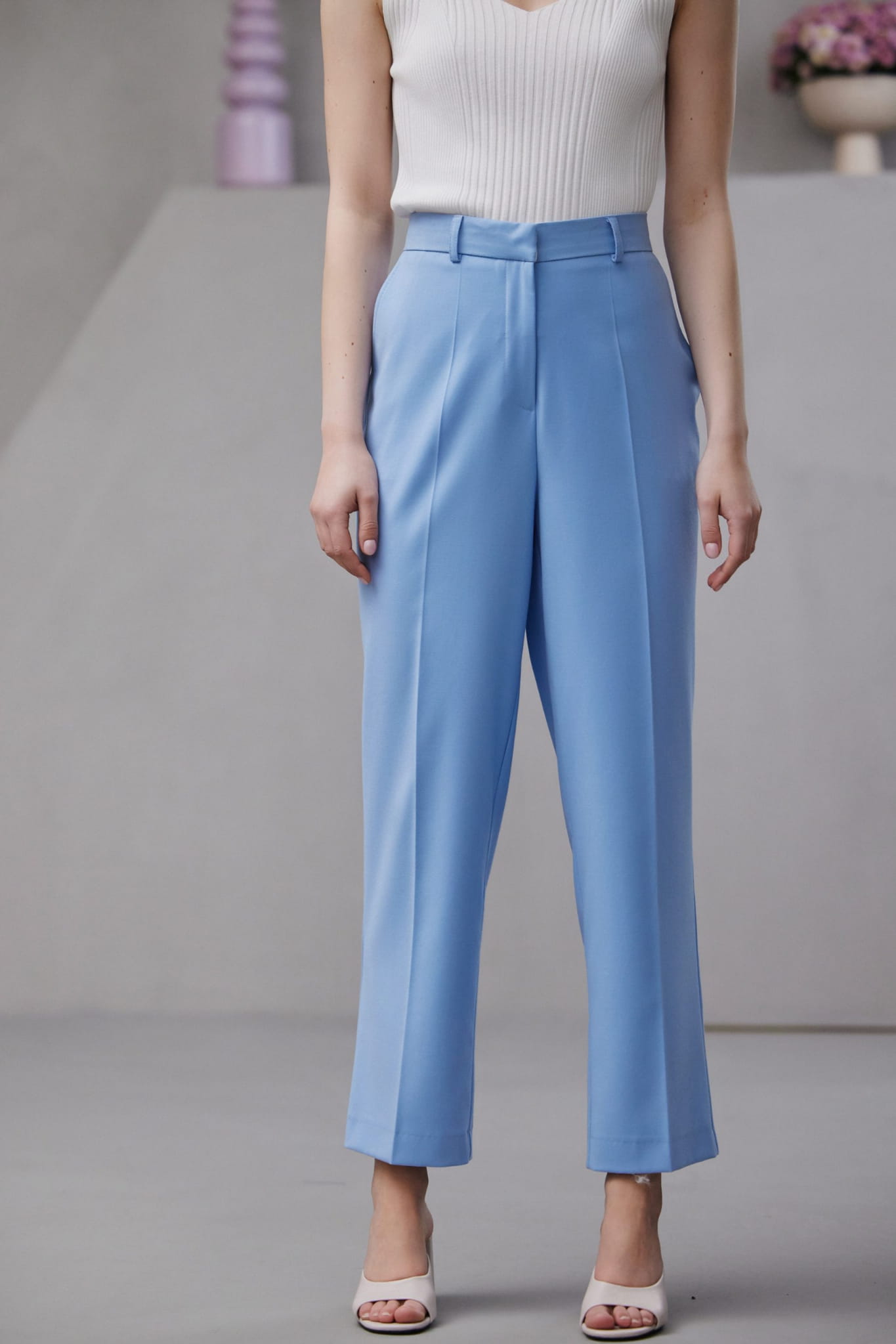 Spodnie z prostym paskiem i szlufkami w niebieskim kolorze. Zaprasowane na kant. Odszyte w pasie gurtem, zapinane na kryte haki.Nogawka regularna, delikatnie zwężająca się ku dołowi. Fason nie jest bardzo dopasowany, nie opina sylwetki. Ten model ma kieszenie i rozporek w przodzie. Tkanina delikatnie elastyczna.