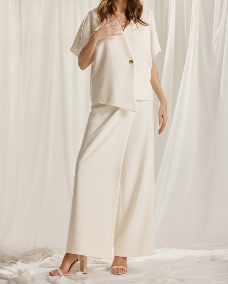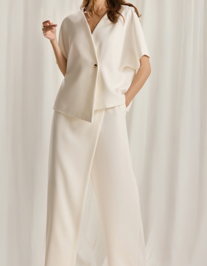Asymetryczne spodnie z dodatkową nogawką. Zapinane na suwak kryty w boku.