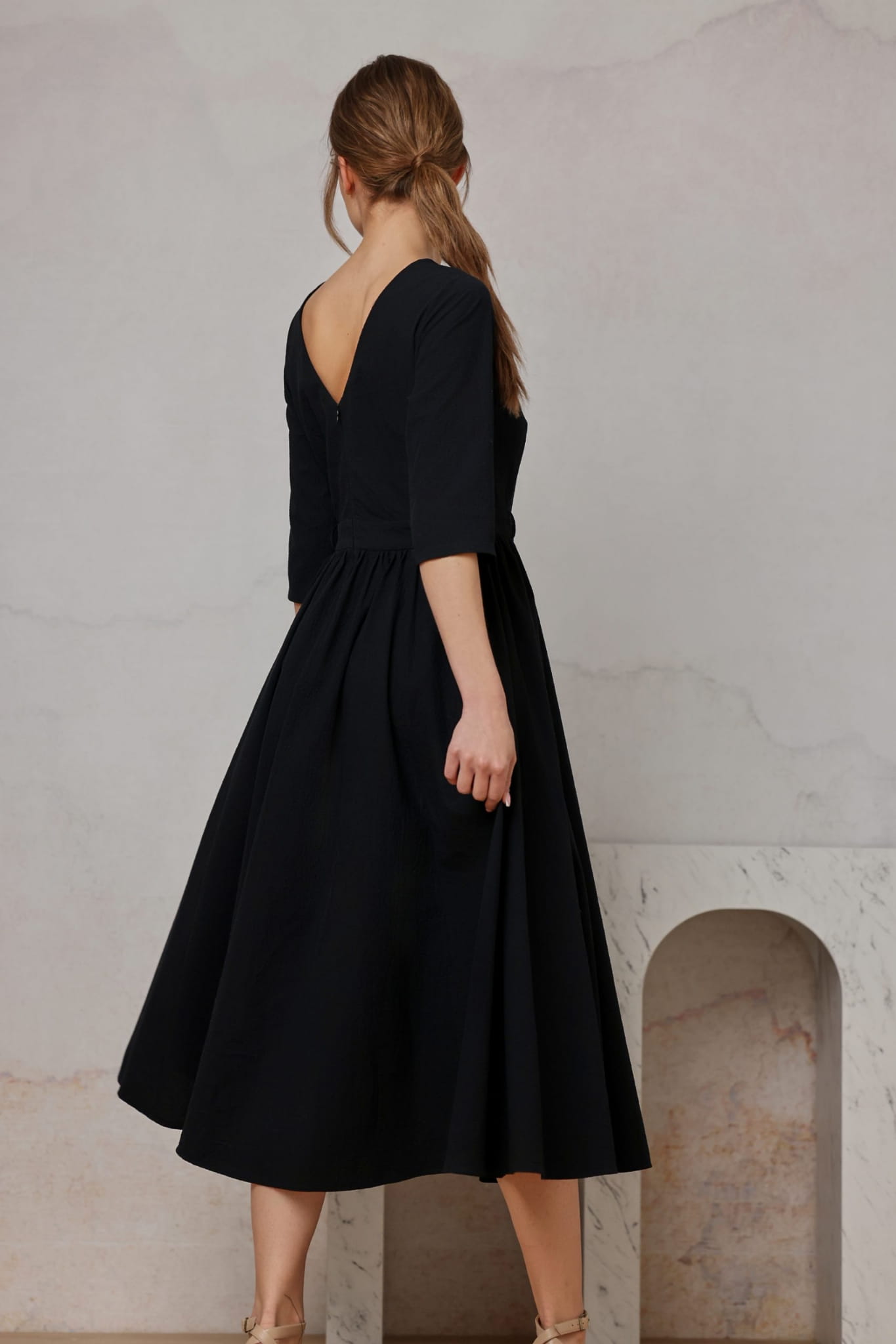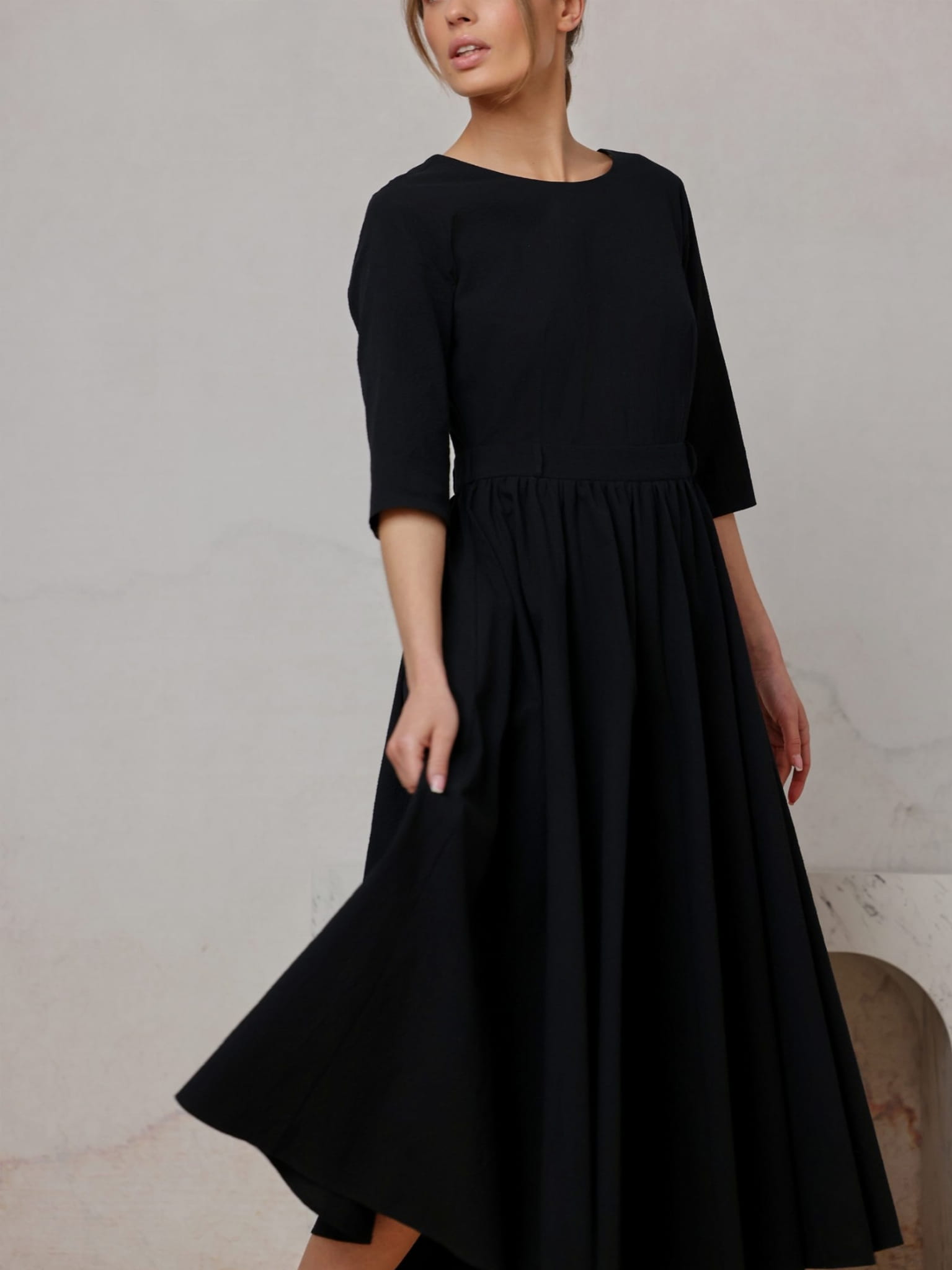 Czarna skromna sukienka z rękawem sięgającym przed łokieć.