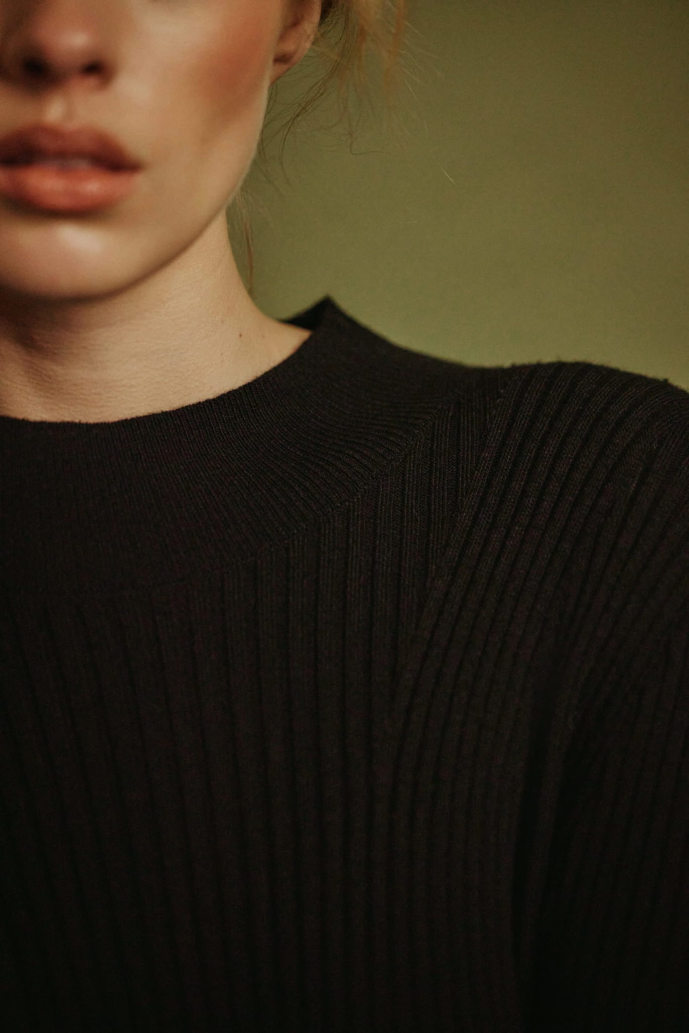 Sukienka ze szlachetnej przędzy w kolorze czarnym, dopasowana do sylwetki. Z długim, wąskim rękawem i półgolfem.