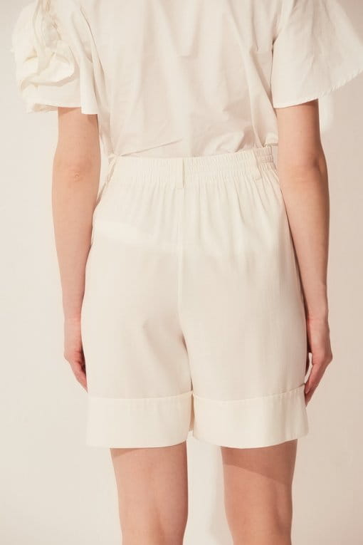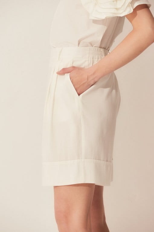 Szorty na pasku z podkroju w przodzie, z tyłu w pasie stębnowana guma. Spodnie z prostymi nogawkami, z zakładką w przodzie i szlufkami. Dół nogawek zakończony szerokim mankietem. Długość przed kolano. Fason swobodny, z kieszeniami. Tkanina jest delikatnie przezroczysta.