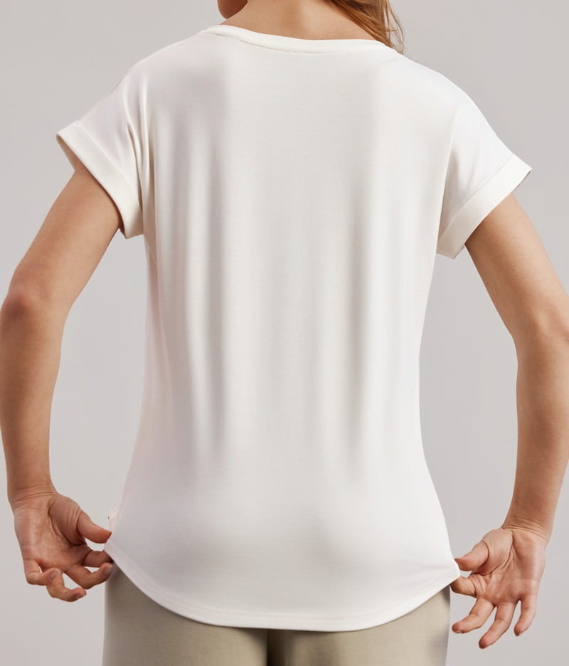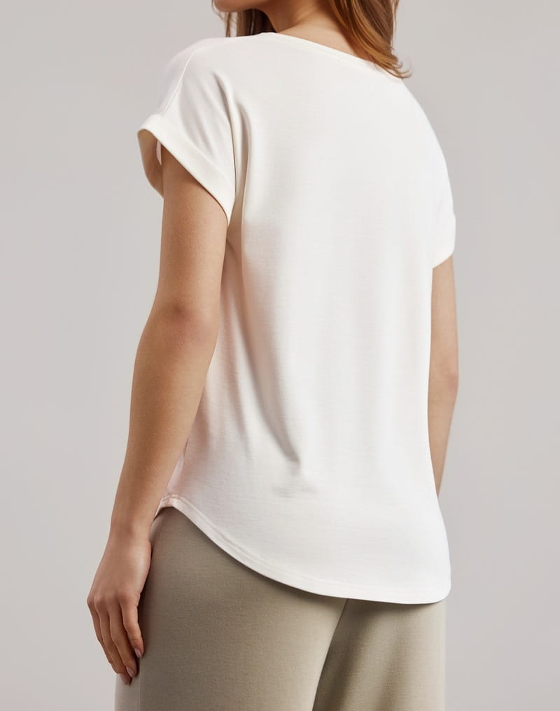 T-shirt uszyty z dzianiny bambusowej z dekoltem w serek, wykończonym pliską.