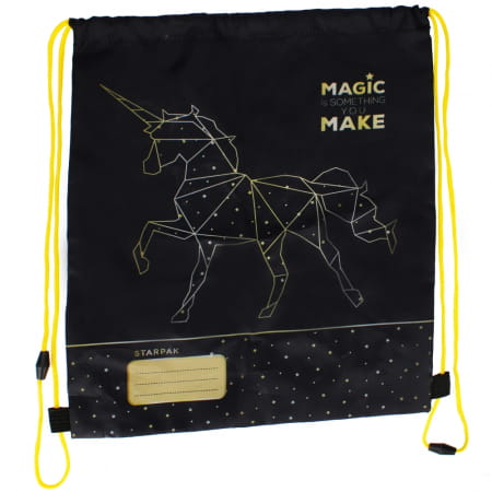 Zalety produktu worek na buty i nie tylko, system sznurków, sznurki łączone systemem zatrzaskowym, łatwe do rozłączenia, wywietrzniki zapewniają cyrkulacje powietrza, wytrzymały i odporny na zabrudzenia materiał, miejsce na podpisanie worka imieniem i nazwiskiem właściciela. Worek na ramię to propozycja firmy STARPAK. Worek nie musi służyć tylko do noszenia kapci czy butów, można go także wykorzystać jako plecak na wycieczkę czy rower. Worek dzięki długim sznurkom, daje wiele możliwości jego wykorzystania. Wielofunkcyjny i bardzo wytrzymały worek. Worek w czarno-złotej kolorystyce. Zapoznaj się również z innymi produktami STARPAK z serii z Unicornem. Wykonany z trwałego materiału. Worek jest wyrobem tekstylnym. Przeznaczony dla dzieci w wieku 3 . Wymiary produktu wys.x szer. cm 40x34 cm, waga produktu kg 0,05 kg. Worek pakowany w folię..