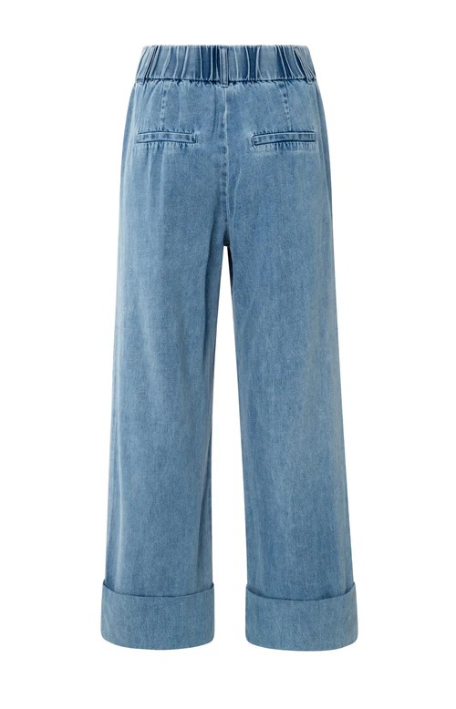 Te spodnie to wygodny model z szerokimi nogawkami i podwiniętymi mankietami. Wykonane są z miękkiej tkaniny łączącej naturalną bawełnę z włóknem Lyocell, dzięki czemu są przewiewne i przyjemne w dotyku. Elastyczny pas gwarantuje komfort noszenia, a prosta forma sprawia, że świetnie sprawdzą się zarówno w casualowych, jak i bardziej eleganckich stylizacjach.